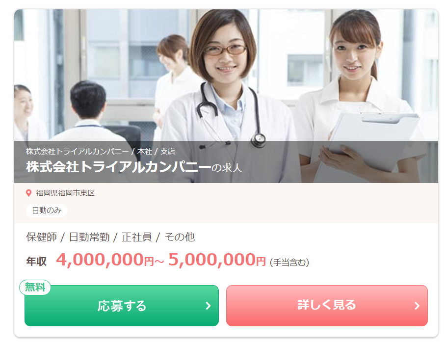 ※上記は求人例です。最新求人は公式サイトでご確認ください。その他にも、多数企業看護師求人がございます。(産業保健師、医務室看護師(健康管理室)、治験コーディネーター(CRC)、臨床開発モニター、クリニカルコーディネーター、学校保健室、大手上場企業内看護師等の求人も多数)
