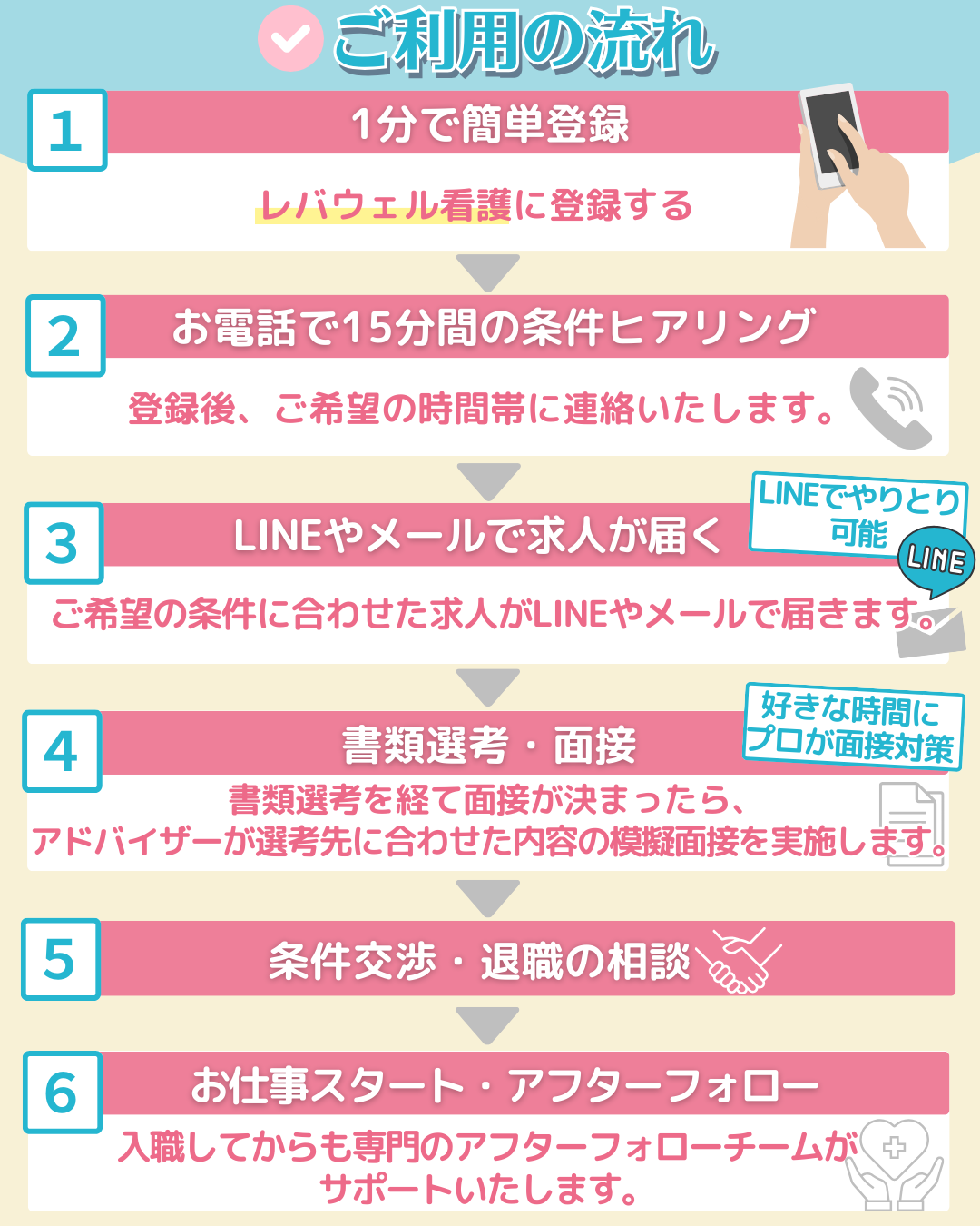 レバウェル看護というサイトを使用しました。最初に、「あまり電話に出れないのでメールでのやり取りを希望します」とお伝えすると、電話をかけてこられることもなくメールでのやり取りだったため仕事をしながらでも自分のペースで転職活動が出来て良かったです。また経歴や長所短所、志望理由などを先方に提出するとしっかり添削、私の性格を分析してくださり書類選考通過に向けた事前準備のフォローがとても手厚く感じました。書類選考合格率4割といわれている企業に転職できたのは、上記の対応のおかげであると思っています。そして、面接から内定、入職1ヶ月、3ヶ月、6ヶ月など定期的に現在の状況についてメールにて連絡を取らせていただいており転職後のフォローもしっかりされている印象です。